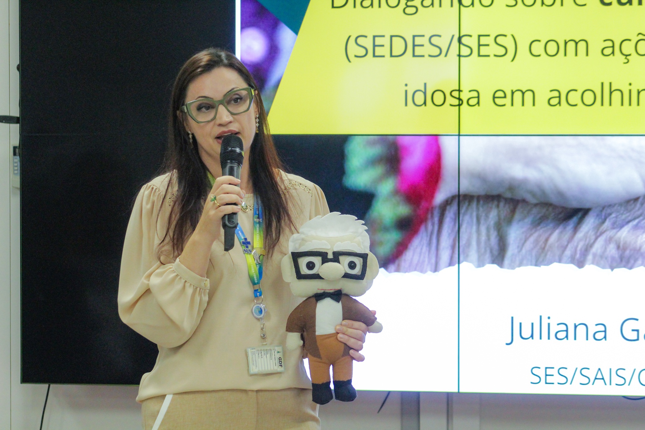 A programação abordou temas fundamentais, como estratégias de cuidado, fortalecimento dos vínculos afetivos e desafios da proteção social. A fisioterapeuta da SES-DF Juliana Cunha apresentou o tema “Desafios e Estratégias na Proteção e Cuidado à Pessoa Idosa Institucionalizada” e destacou a importância da autonomia e do bem-estar no envelhecimento. “Hoje temos a oportunidade de desenvolver soluções conjuntas. Precisamos lembrar que o idoso tem preferências, uma história de vida e merece respeito. E não podemos esquecer do cuidador, que também precisa de suporte para garantir um atendimento de qualidade”, enfatizou.