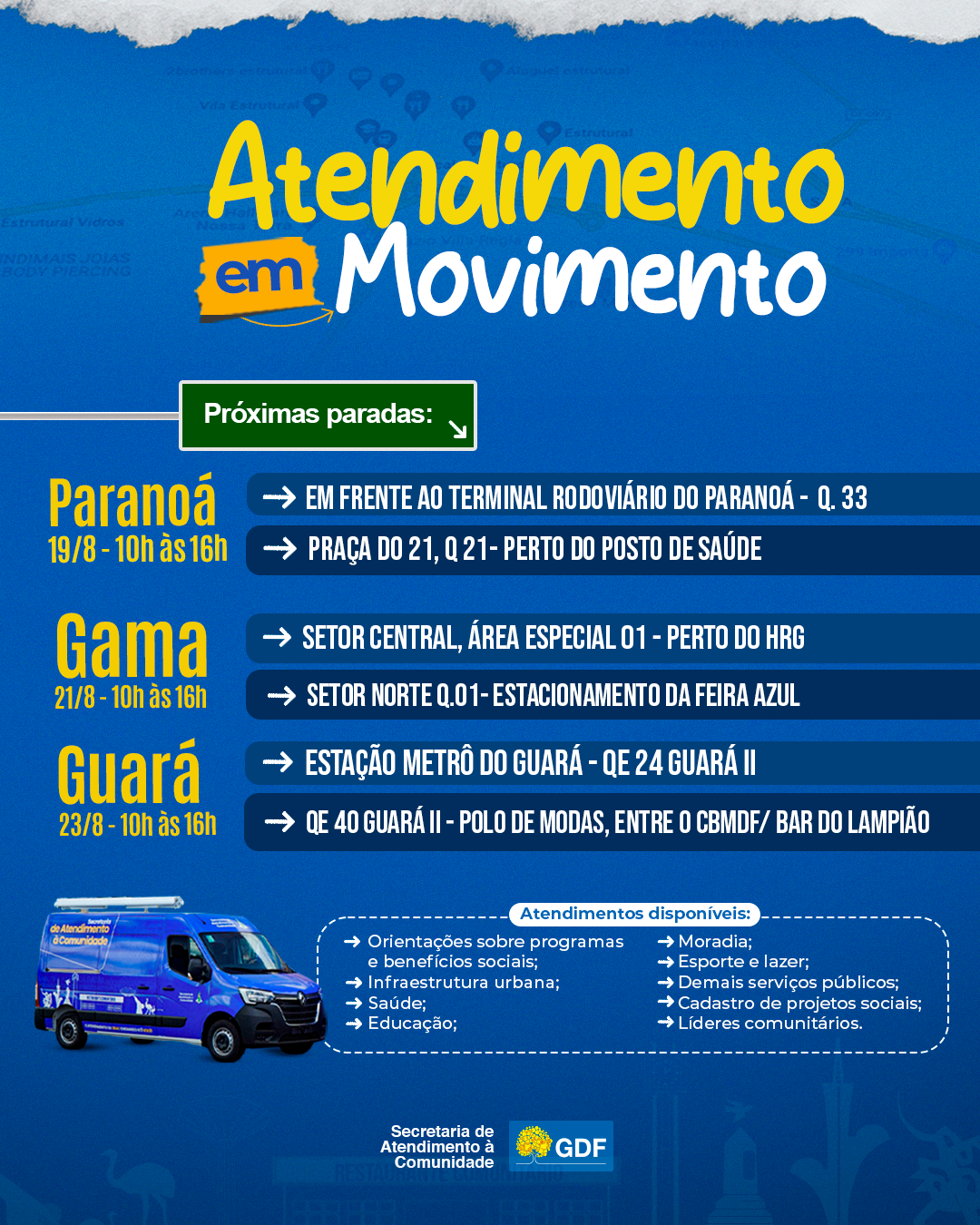 O projeto Atendimento em Movimento, instituído pela Secretaria de Atendimento à Comunidade do Distrito Federal (Seac-DF), tem sido uma ferramenta eficaz para aproximar o Governo do Distrito Federal (GDF) das diversas regiões administrativas do DF. Ao levar uma escuta ativa e humanizada diretamente às comunidades, o projeto não só identifica as demandas mais urgentes, como também fortalece o vínculo entre a população e o poder público.
