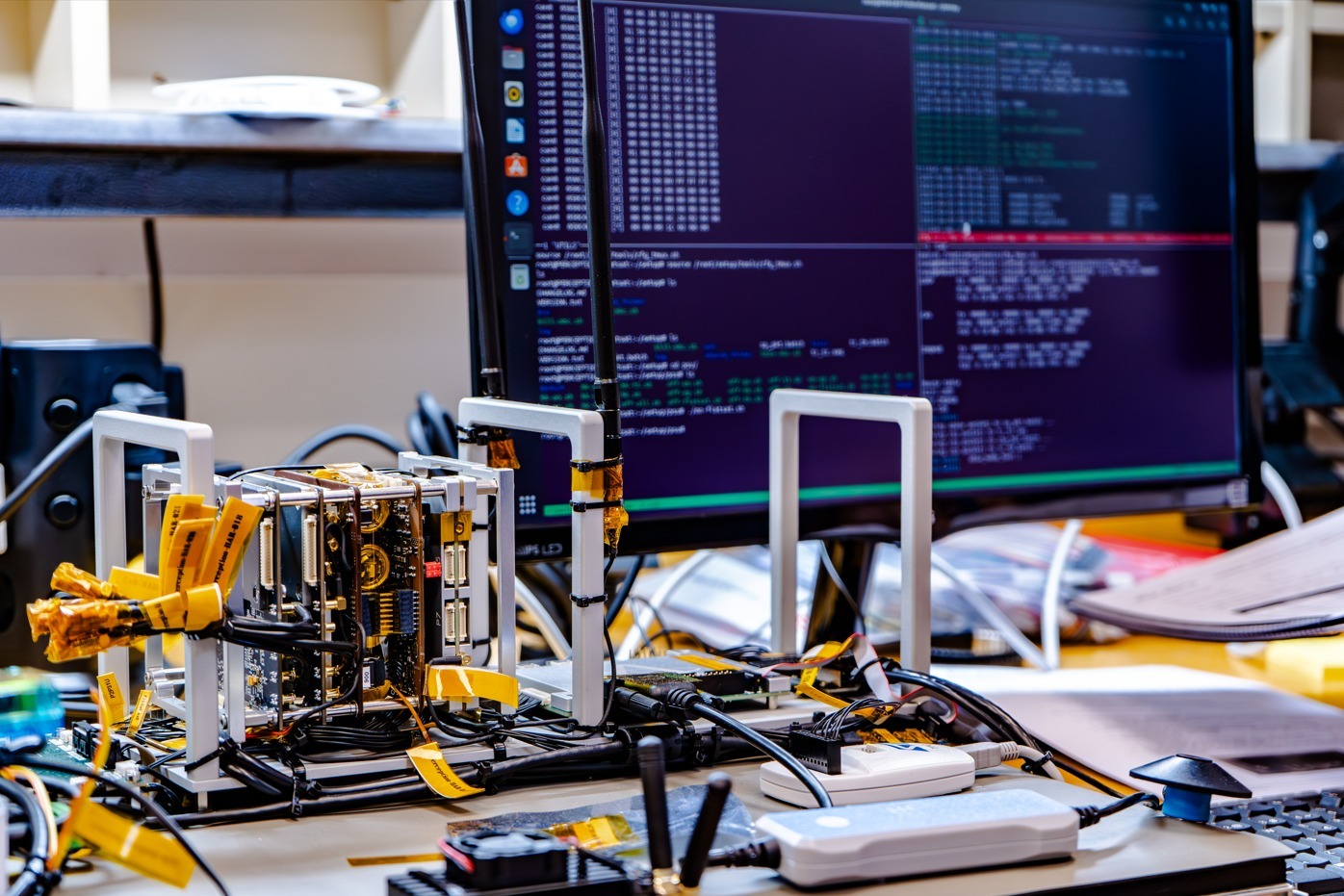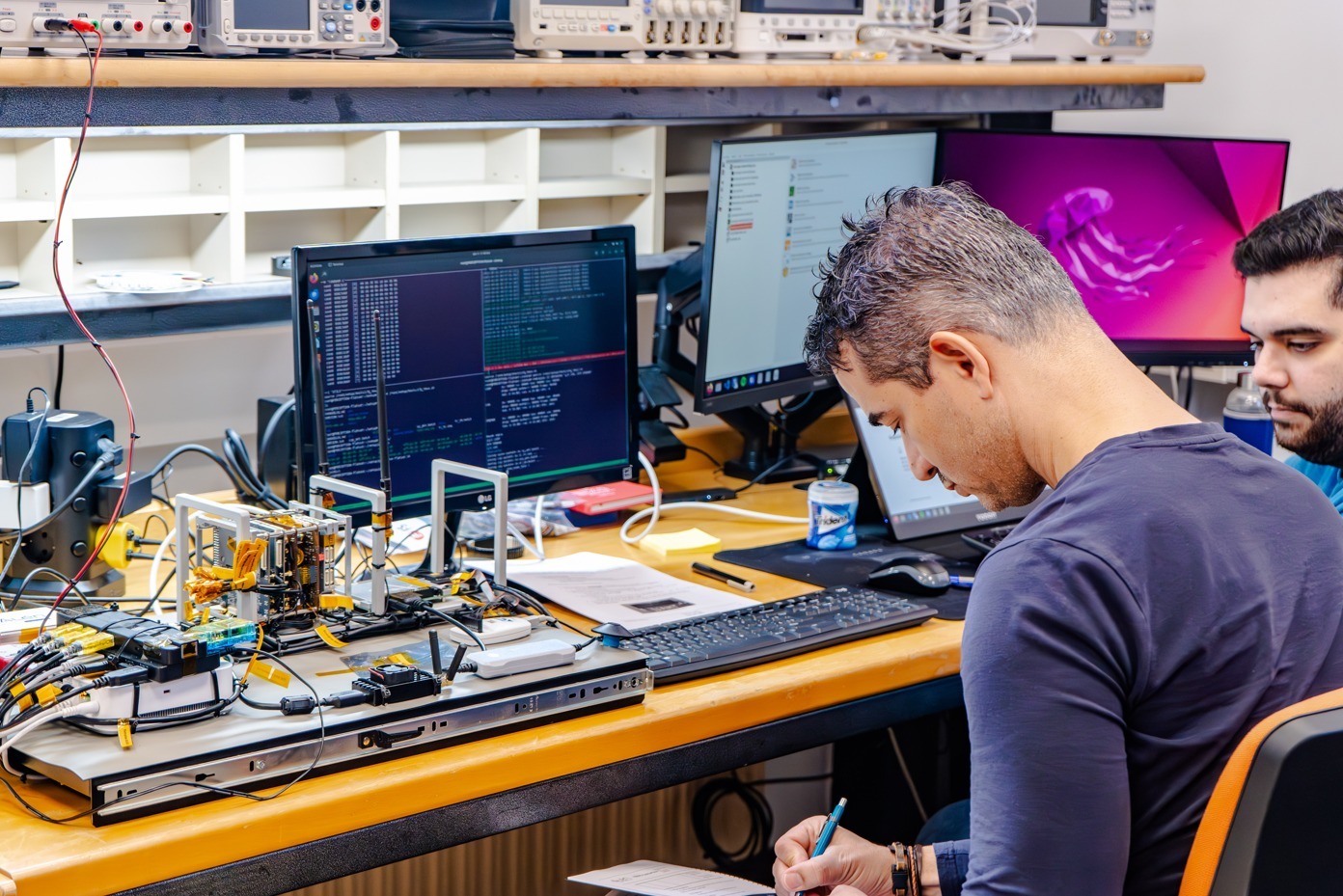 O professor Renato Alves Borges e o engenheiro Ignacio Gonzalez-Rua durante demonstração tecnológica ponta a ponta de solução de coleta de dados para o Perceive, semelhante à utilizada na missão AlfaCrux