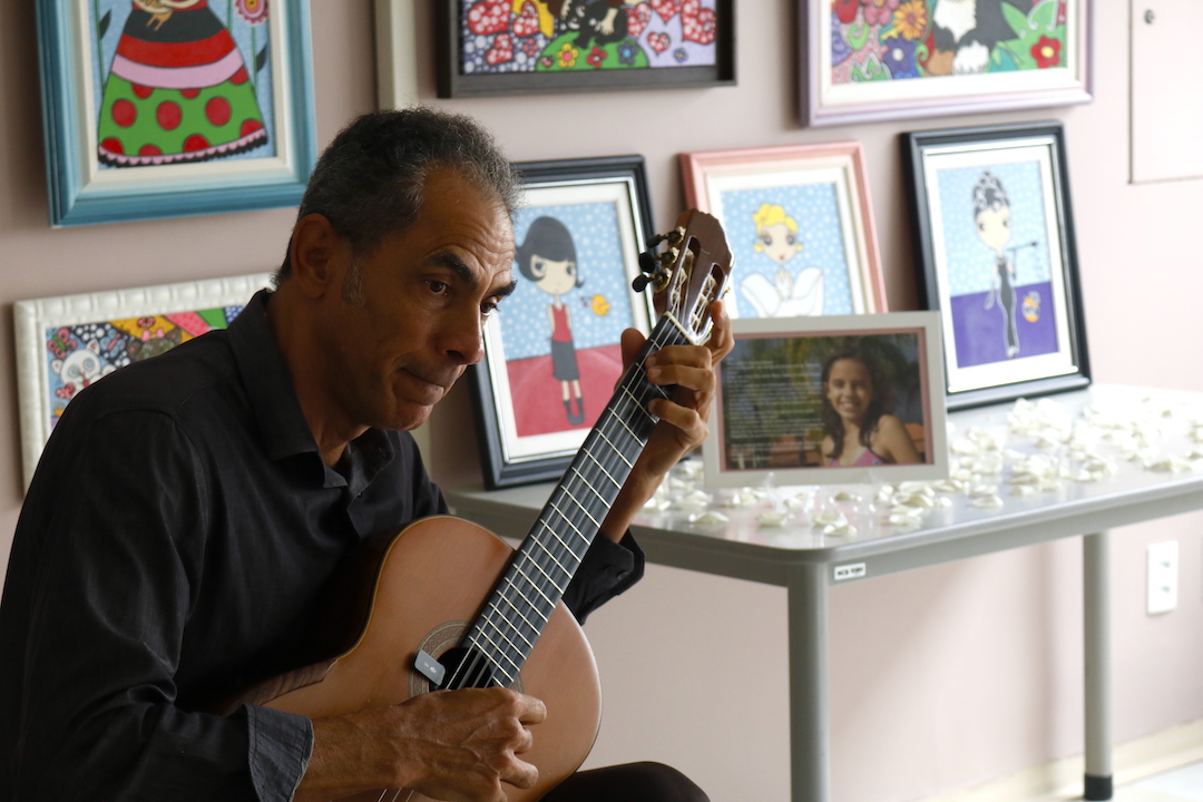 A doação dos quadros foi marcada por outra homenagem a Giovana – desta vez, em forma de música. “Pensávamos, como ela, em sair daqui com a cura e dar seguimento à vida. Ela me dizia: ‘pai, nós temos que vir aqui tocar para as crianças, eu no violino e você no violão’”, explica Humberto.