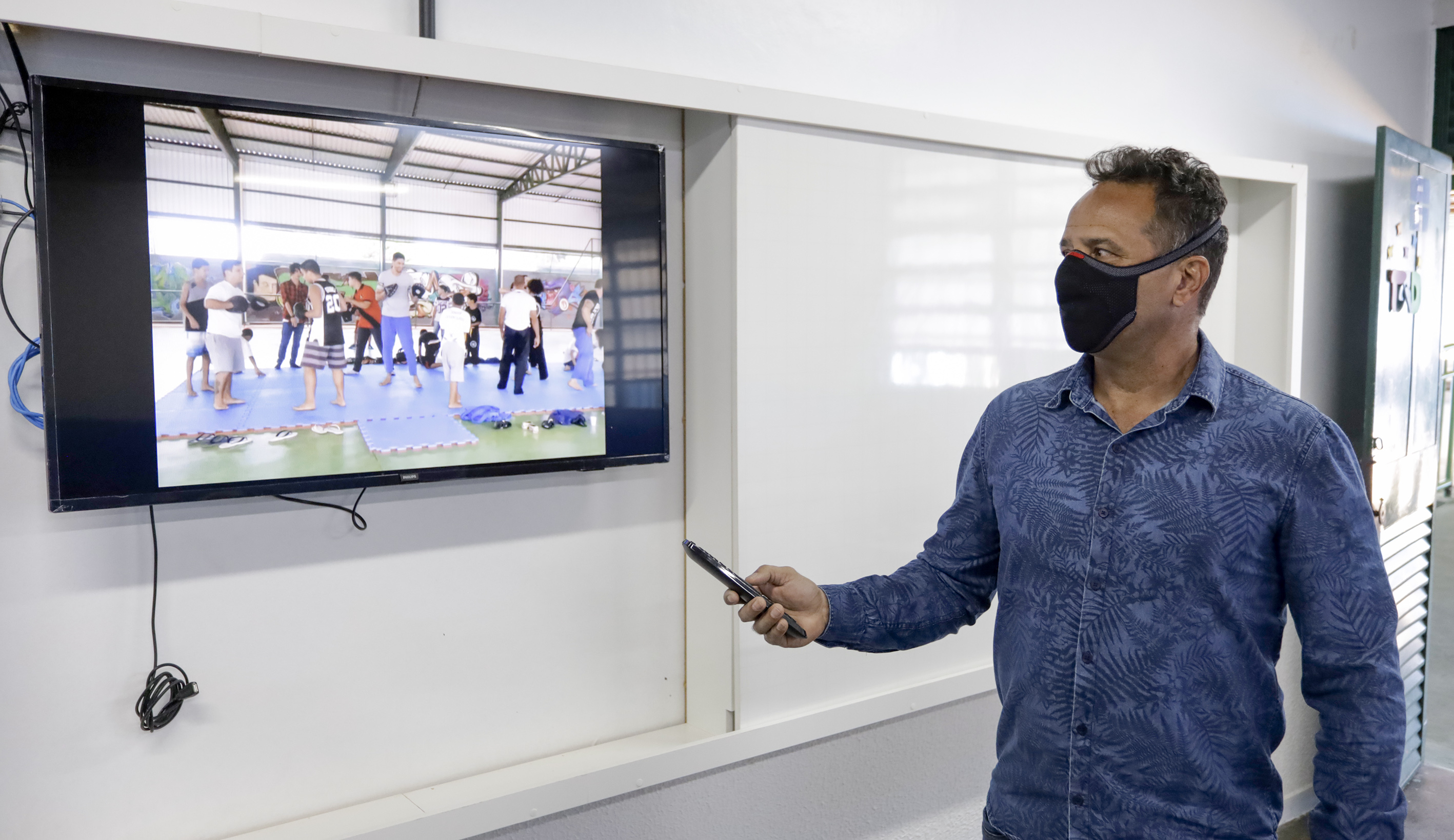 Diretor do CEF 412, Castorino Alves, mostra novas TVs compradas com recursos do Pdaf | Foto: Divulgação/Secretaria de Educação