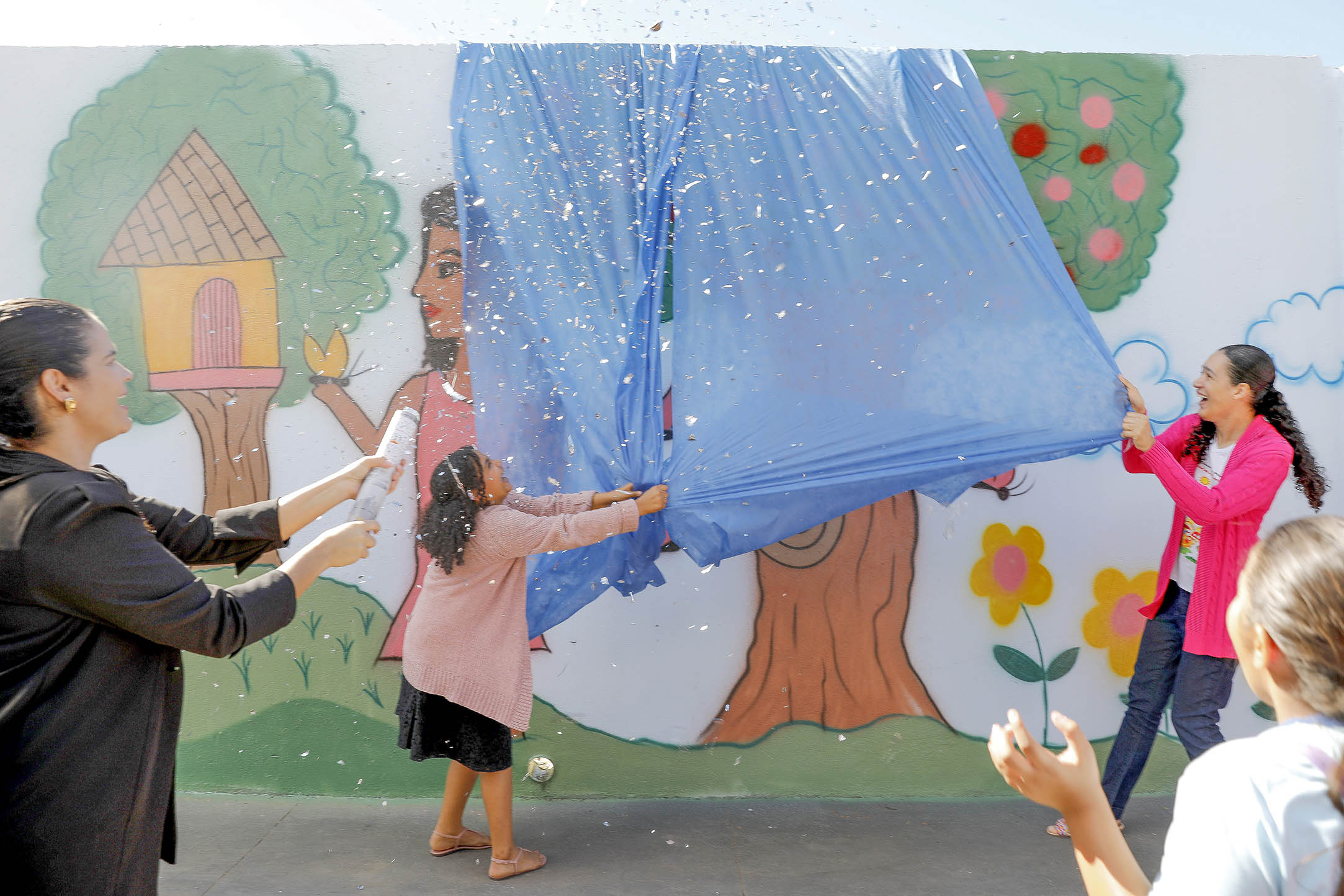 “A ideia partiu de uma reforma que fizemos na CRE, e queríamos representar uma janela de sentimentos dos nossos estudantes”, explica a coordenadora da Regional de Ensino de Planaltina, Raíssa Monteiro. “Após elegermos os vencedores, o artista levou cinco dias para copiar o material no muro. Foi necessário projetar as obras de arte em tamanho real para que ele pudesse pintar de maneira mais idêntica possível.”