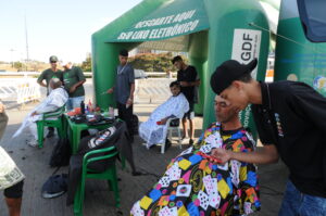 Durante o evento de inauguração do papa-lixo, frequentadores da rodoviária também tiveram acesso gratuito a corte de cabelos e pintura de rosto | Foto: Paulo H. Carvalho/Agência Brasília