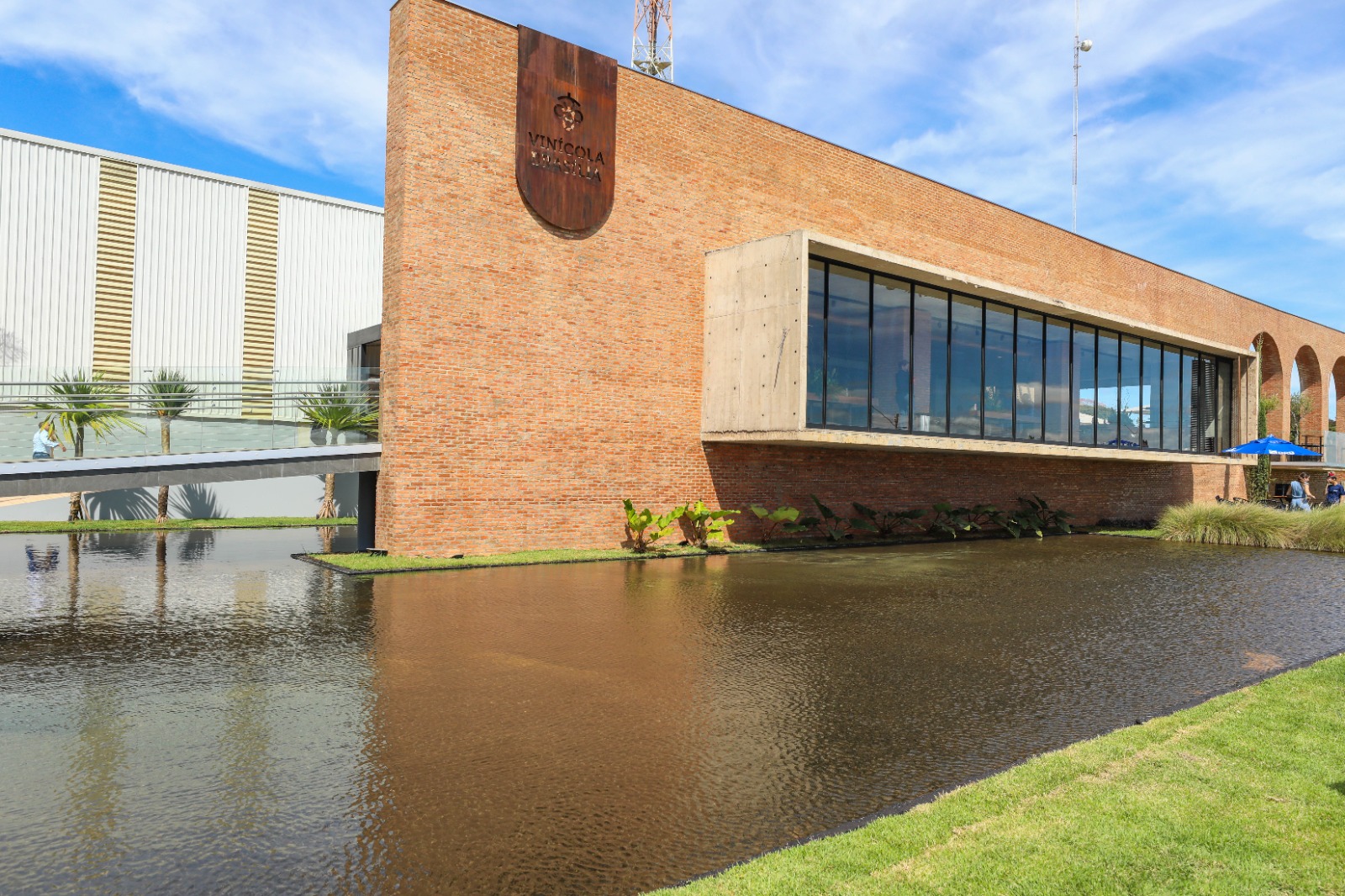 A arquitetura da vinícola remete a elementos típicos de Brasília: concreto, arcos e espelho d’água