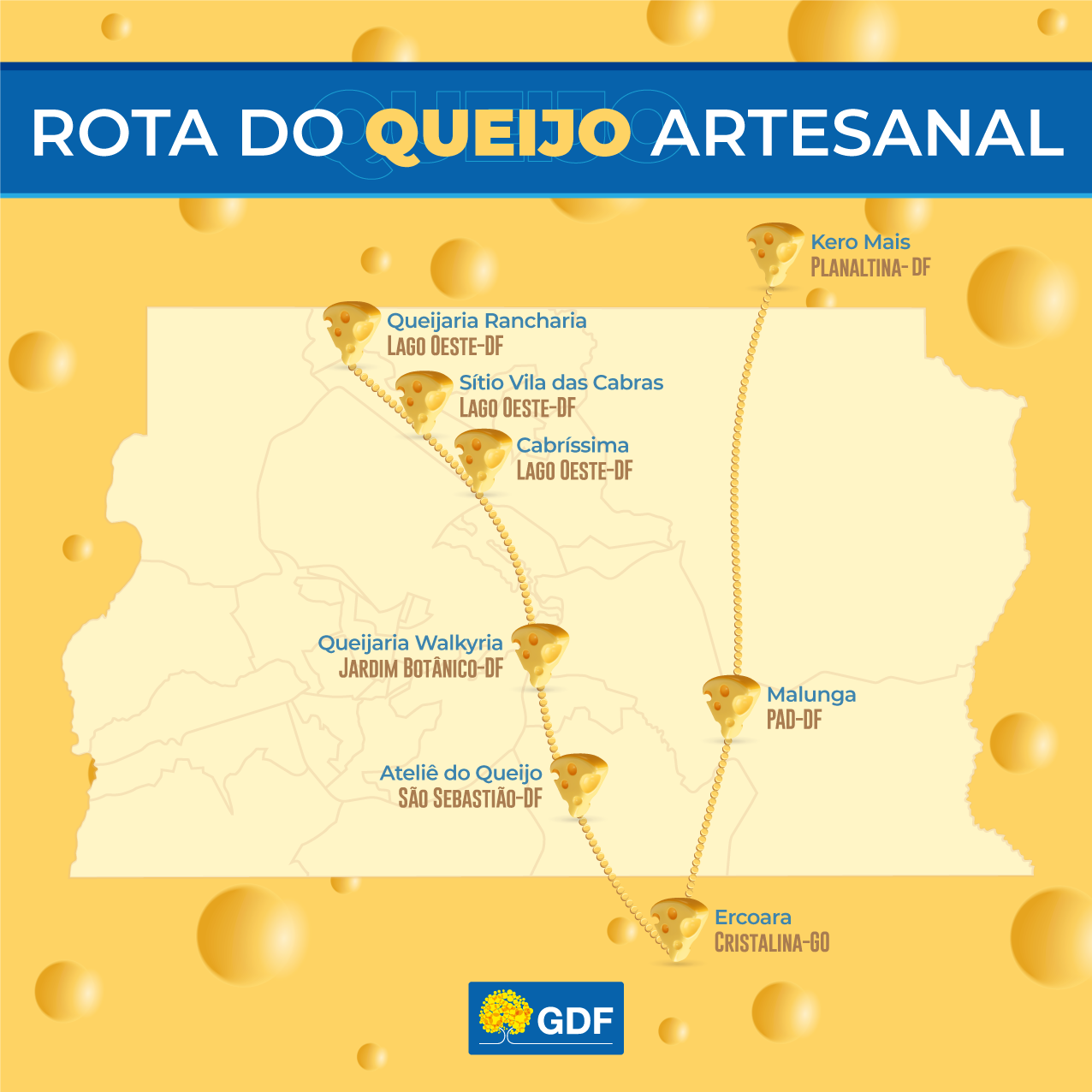 Visando o potencial do turismo rural do Distrito Federal e Entorno, o GDF lançou, nesta quinta-feira (25), a Rota do Queijo Artesanal durante evento na sede da Empresa de Assistência Técnica e Extensão Rural do Distrito Federal (Emater-DF). A iniciativa reúne oito precursores na produção de laticínios e criação de ovelhas e cabras, que contam com projetos formalizados e preparados para receber visitas turísticas. São eles: Queijaria Rancharia, Sítio Vale das Cabras, Cabríssima, Queijaria Walkyria, Ateliê do Queijo, Malunga, Kero Mais e Ercoara.