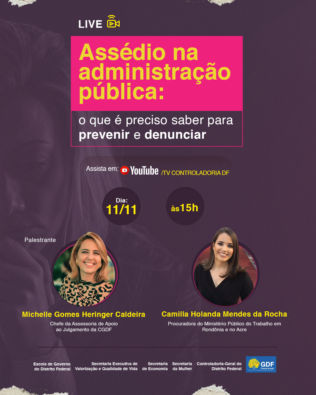 A live contará com duas palestrantes: a chefe da Assessoria de Apoio ao Julgamento da Controladoria-Geral do DF (CGDF), Michelle Heringer, que fará a contextualização do tema no DF e apresentará conceitos gerais; e a procuradora-chefe do Ministério Público do Trabalho em Rondônia e no Acre, Camilla Holanda, que abordará a perspectiva da chefia – como diferenciar o assédio moral dos atos de gestão.