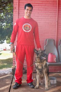 O sargento Victor Mendonça e o cão Sheik atuaram juntos no resgate de vítimas das enchentes no Rio Grande do Sul | Foto: Matheus H. Souza/Agência Brasília
