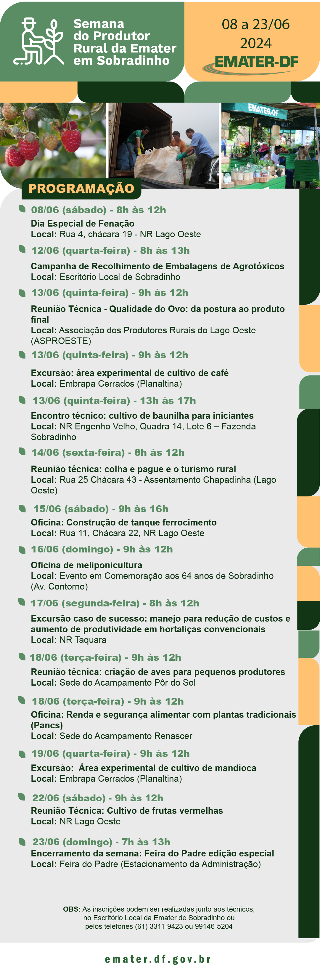 Com o objetivo de promover a integração e capacitação de produtores rurais da região, a Empresa de Assistência Técnica e Extensão Rural (Emater-DF) promove a Semana do Produtor Rural de Sobradinho, entre os dias 8 e 23 de junho. O evento traz palestras, excursões técnicas, reuniões sobre atividades produtivas com potencial de desenvolvimento na região, além de campanha de recolhimento de embalagens de agrotóxicos.