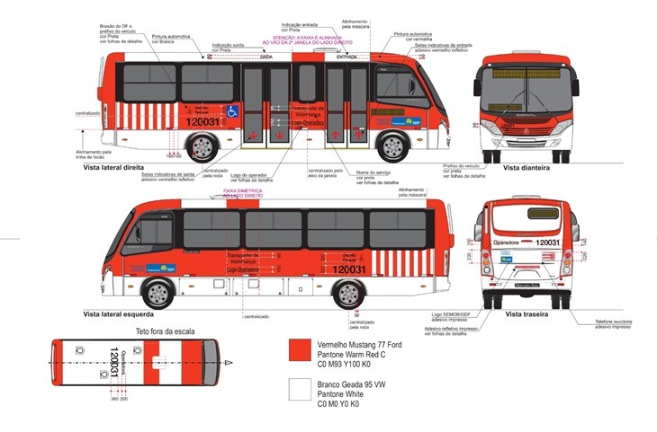 Os modelos originais tinham cores que contrastavam com a dos outros ônibus do início da capital. Primeiramente em laranja e depois em vermelho, os micro-ônibus listrados com uma dessas cores e com o branco circularam até 2012.