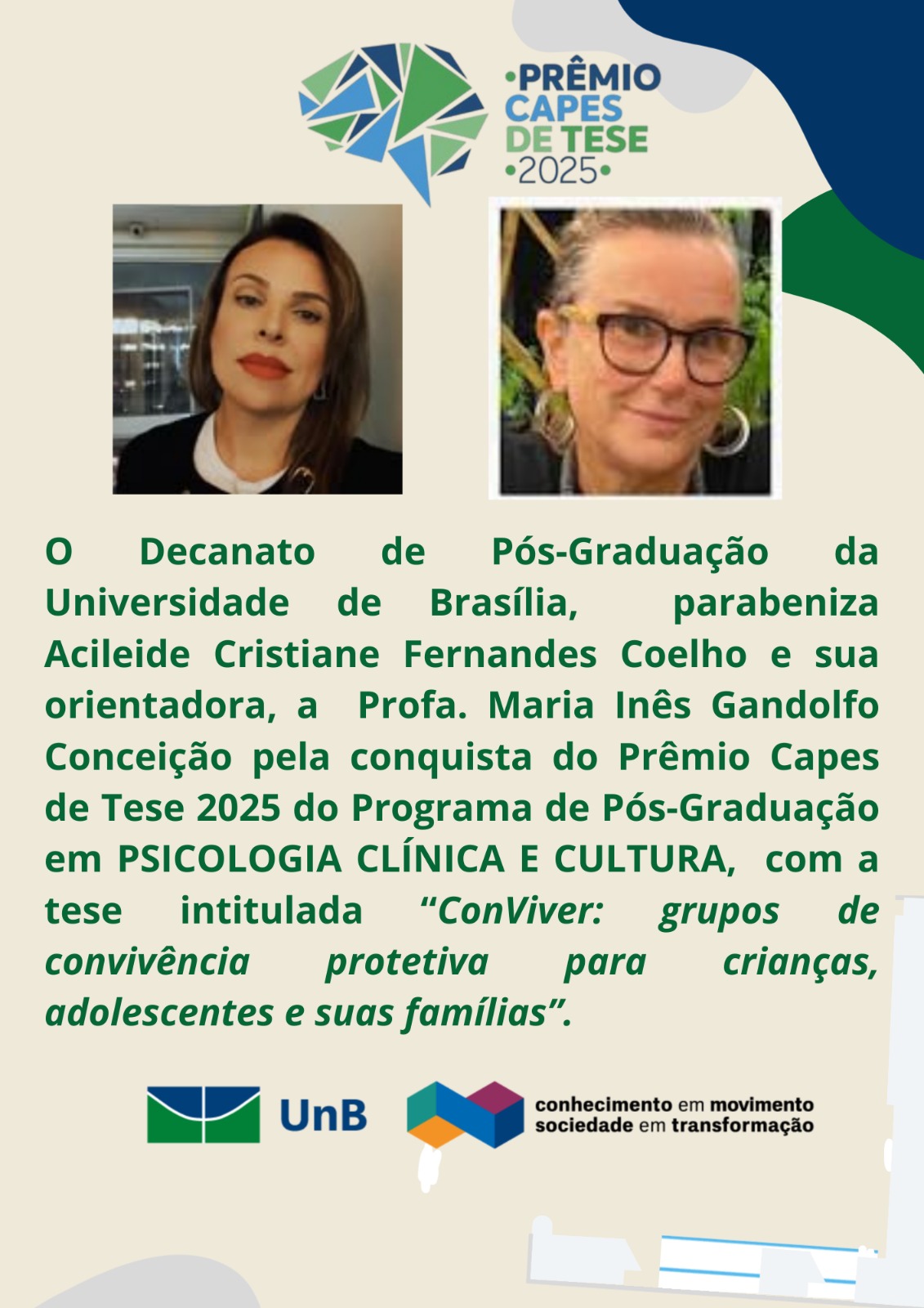 “Acredito que este prêmio também simbolize o reconhecimento de todas as famílias que participaram do trabalho e que, juntas, construíram e deram visibilidade à importância de criar espaços coletivos que garantam acesso a serviços e segurança de convívio”, declara Acileide. A pesquisa também passa a concorrer, automaticamente, ao Grande Prêmio Capes de Tese, cujo resultado será divulgado em dezembro deste ano.