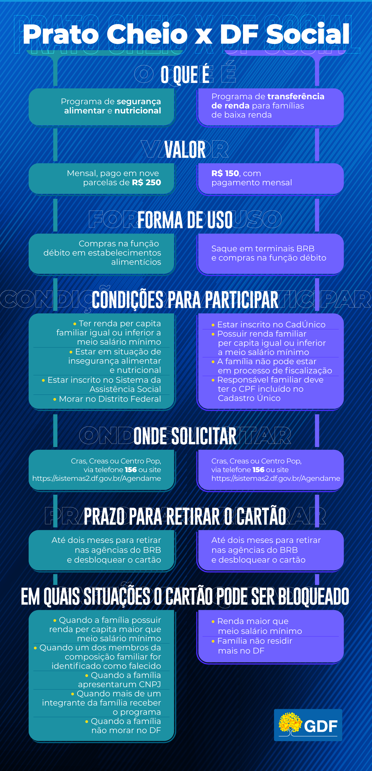 A seguir, a Agência Brasília detalha o funcionamento e esclarece dúvidas sobre dois importantes programas: o Cartão Prato Cheio e o DF Social. A Secretaria de Desenvolvimento Social (Sedes), de antemão, esclarece que a população pode receber os dois benefícios ao mesmo tempo.