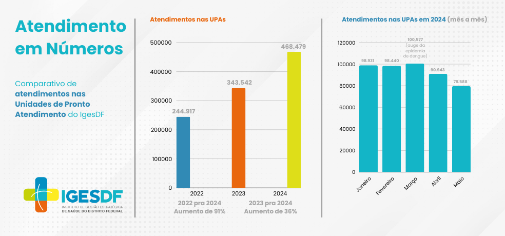 Se comparado aos números de 2022, os números são ainda mais expressivos. Há dois anos, de janeiro a maio, foram realizados 244.917 atendimentos, ou seja, uma diferença de 91% entre 2022 e 2024. “É um número impressionante, que mostra o esforço, a dedicação e a expertise de todos os profissionais envolvidos nas unidades de pronto atendimento do DF”, afirma o diretor-presidente do IgesDF, Juracy Cavalcante Lacerda Jr.