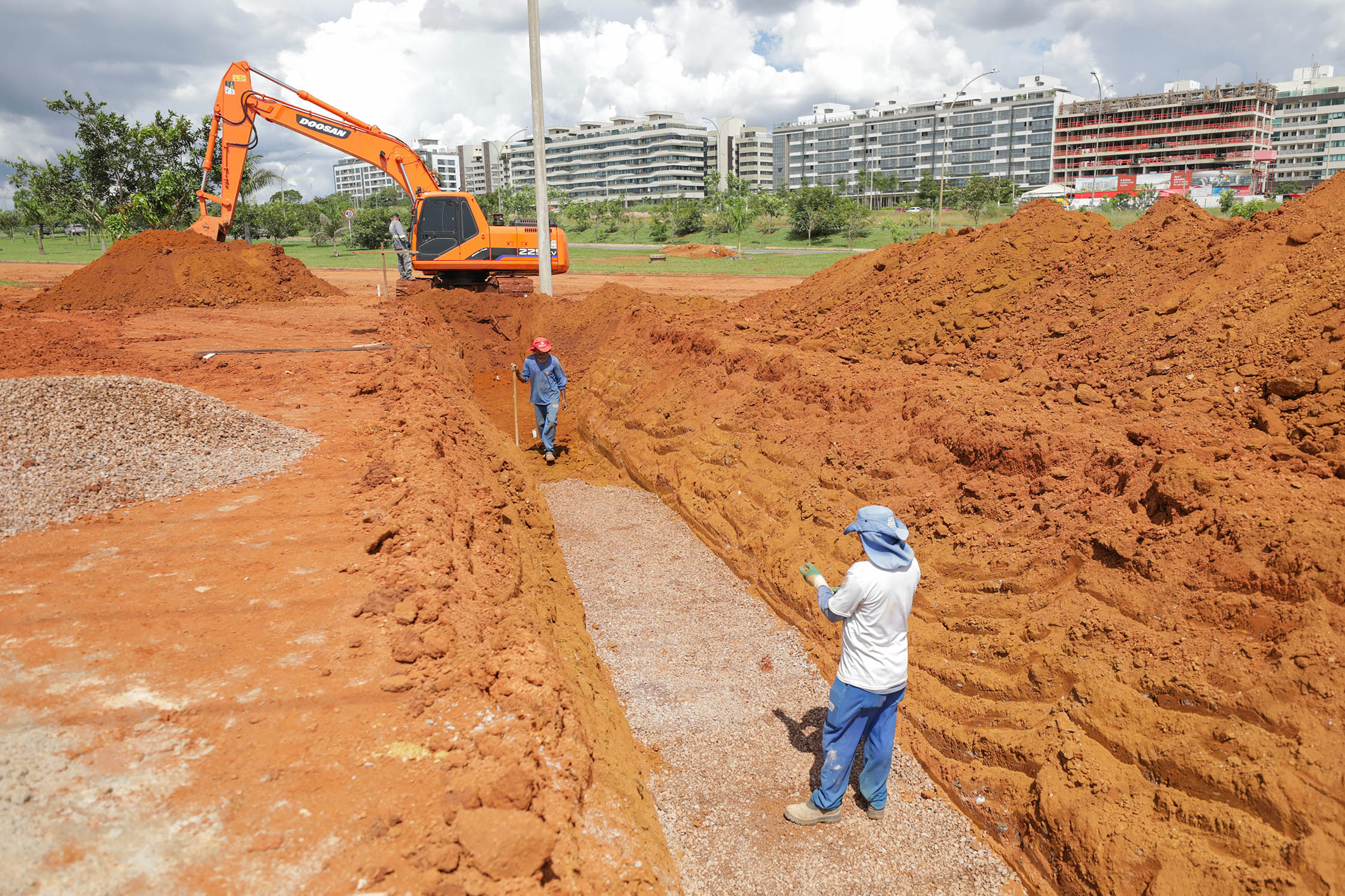 O engenheiro do Departamento de Estradas de Rodagem do Distrito Federal (DER-DF) Geraldo Jacinto explica que, atualmente, os trabalhos estão divididos em três frentes. “Estamos fazendo o aterro para encabeçamento da fundação que a gente já fez; estamos ainda fazendo a parte de drenagem; e estamos fazendo a escavação para início da fundação dos blocos de pilar central do viaduto”, apontou.