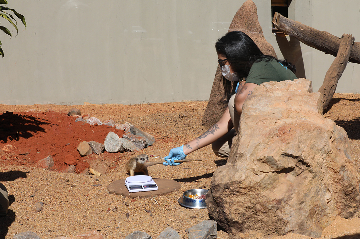 Os suricatos são animais carnívoros e habitam regiões áridas da África. Também comem ovos e alguns legumes, mas a preferência alimentar é a carne. Segundo a gerente de Bem-Estar animal do Zoológico, Camila Rocha, o condicionamento é feito pelas equipes integralmente desde a chegada dos animais. Duas vezes por dia, Camila entrava no recinto para que os suricatos se acostumassem com sua presença e não a vissem como ameaça.