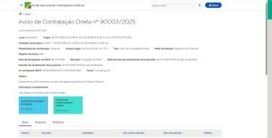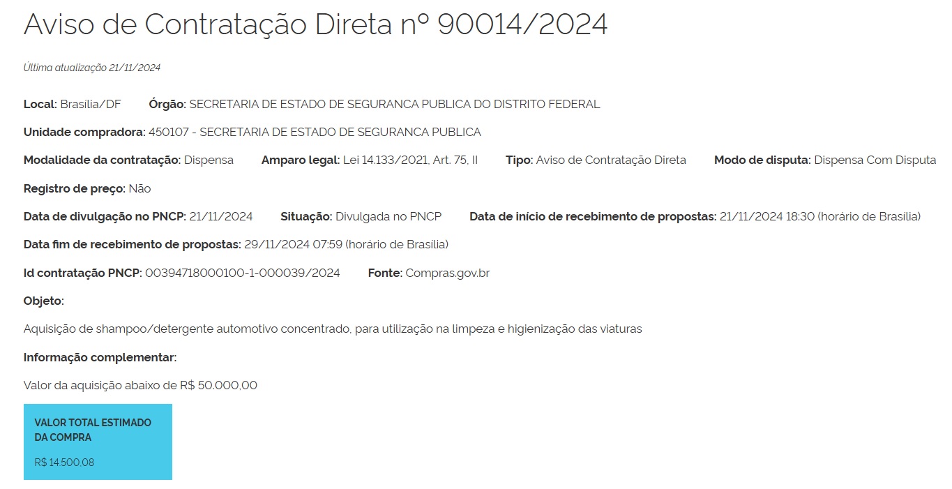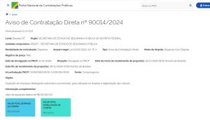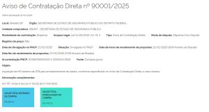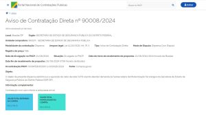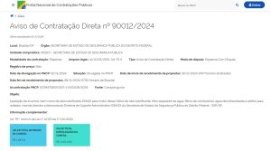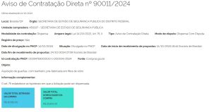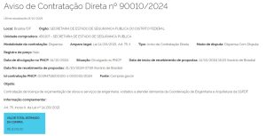 9000 13/2024 | 00050-00016264/2023-01 | Serviços de pesquisa telefônica de opinião pública em abordagem metodológica quantitativa, para aferir a qualidade do atendimento emergencial realizado pelos órgãos de Segurança Pública do Distrito Federal e da reputação dos serviços prestados junto aos públicos de interesse, compreendendo o planejamento, a coleta de dados, análise dos achados, elaboração de relatórios e apresentação de resultados. | 24/06/2024 | PE n° 13/2024 | —– | Termo de julgamento | Termo de Homologação | —– |