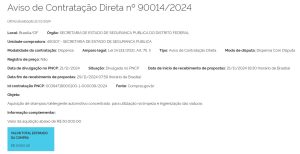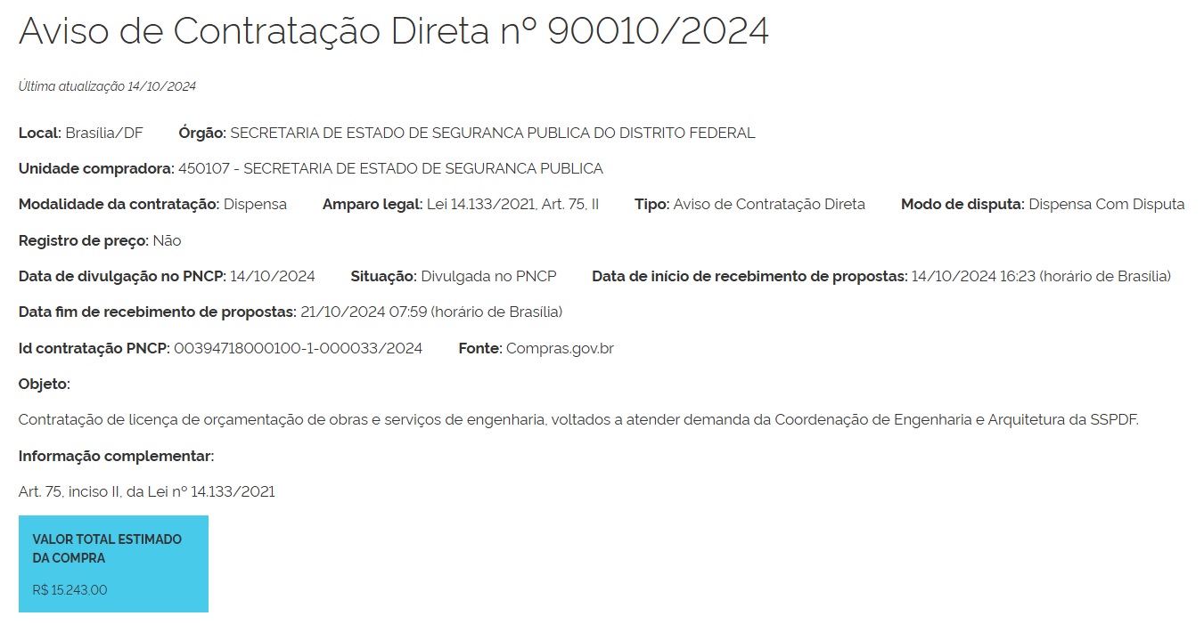 | 00050-00003827/2023-93 | Contratação de cursos presenciais de curta duração, com as temáticas: Curso 1 – “Obras e Serviços de Engenharia, segundo a nova Lei de Licitações e Contratos: incluindo ETP, Mapa de Riscos, BIM, Contratação Integrada e SRP para obras”; Curso 2 – “Contratação de Soluções de TI – de acordo com a nova Lei de Licitações, a novíssima IN-94 da SGD/ME e Jurisprudência do TCU”; Curso 3 – “Contratação de Ações de Capacitação e Treinamento: análise sob a perspectiva da nova Lei de Licitações e Jurisprudência do TCU”, à capacitação de 40 servidores da SSSPDF e das Forças de Segurança a ela vinculadas (PMDF, PCDF e CBMDF), com uso de recurso do Fundo Nacional de Segurança Pública – Eixo Fortalecimento das Instituições de Segurança Pública e Defesa Social. | Projeto Básico | DODF | Ratificação de Inexigibilidade de Licitação |