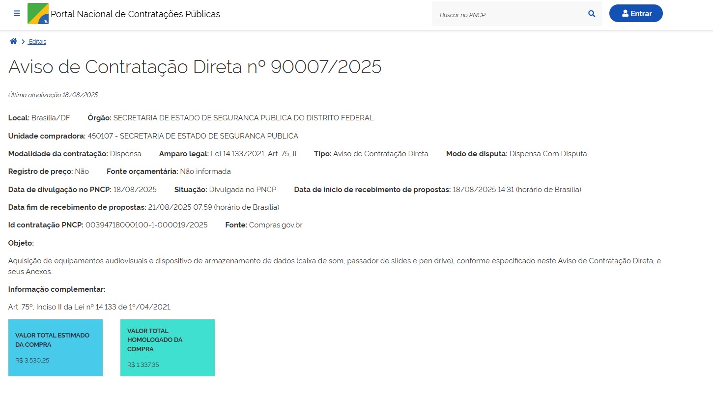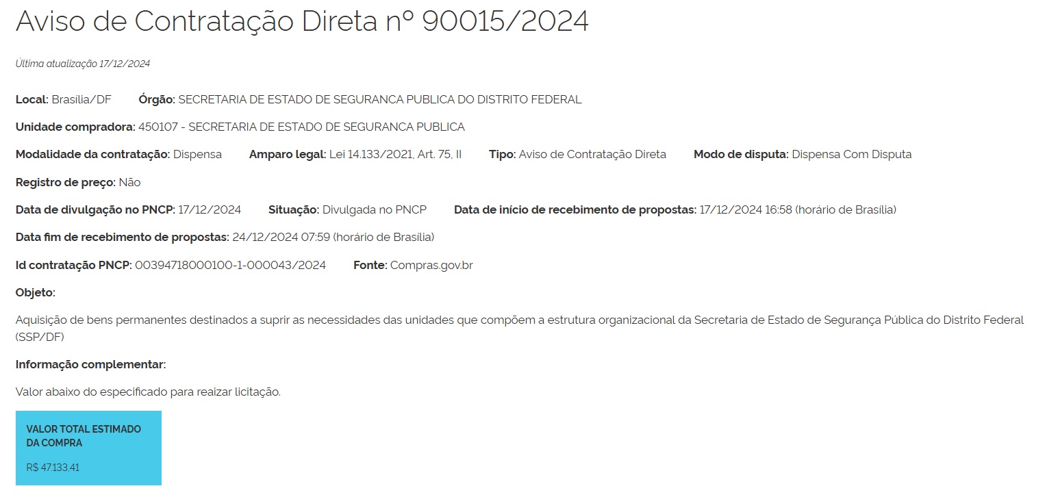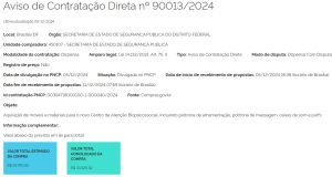 As licitações da Secretaria de Segurança Pública do DF (SSP/DF), na modalidade de Pregão Eletrônico, podem ser acompanhadas em tempo real no https://www.comprasgovernamentais.gov.br/index.php/consultass?layout=edit&id=726
