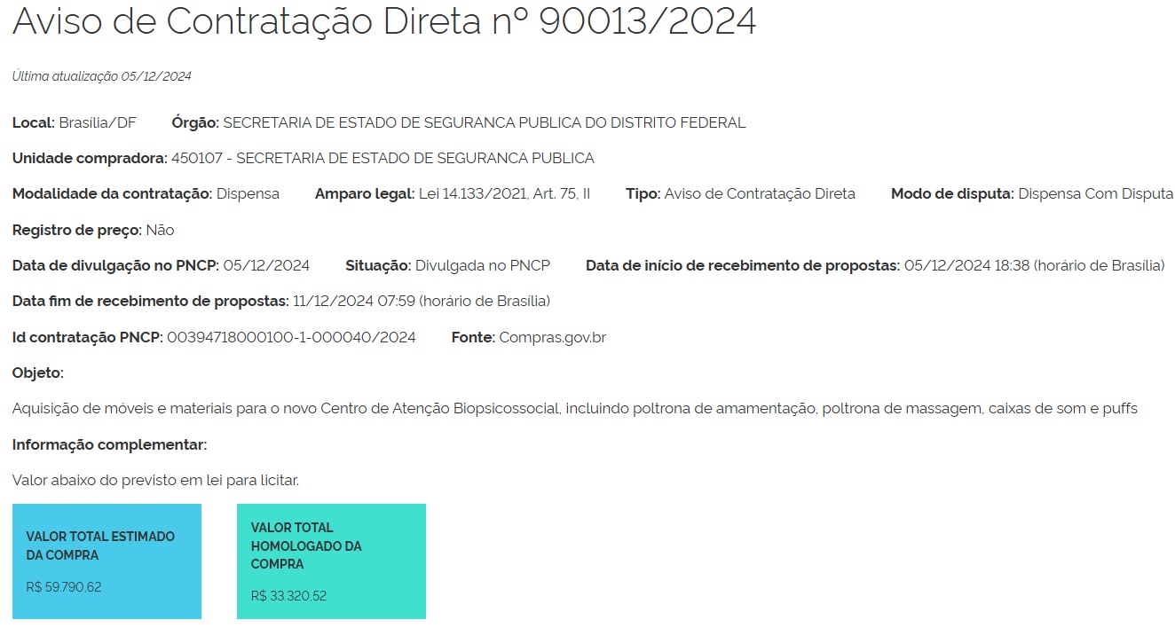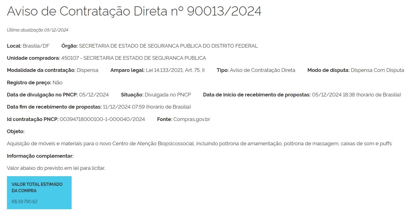 | RDC nº 01 | Contratação de empresa de Engenharia e Arquitetura para construção, recuperação e ampliação de edificação que abrigará o futuro Centro de Apoio BioPsicossocial (CAB), da Secretaria de Estado de Segurança Pública do Distrito Federal, com área de aproximadamente935m2 (novecentos e trinta e cinco metros quadrados), conforme informações e especificações constante no Projeto Básico. | 13/12/2023 | Edital de Licitação Comprasnet