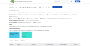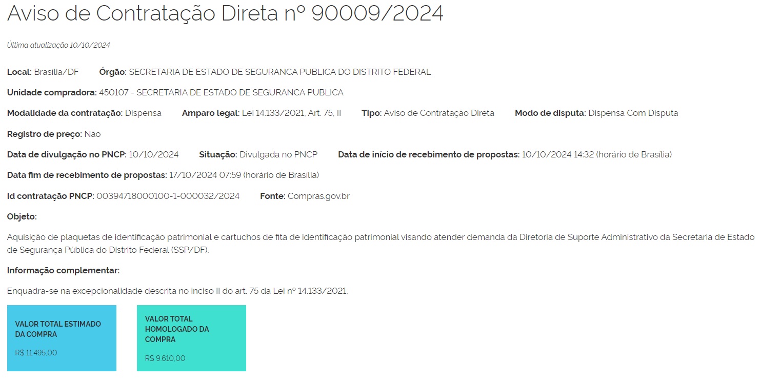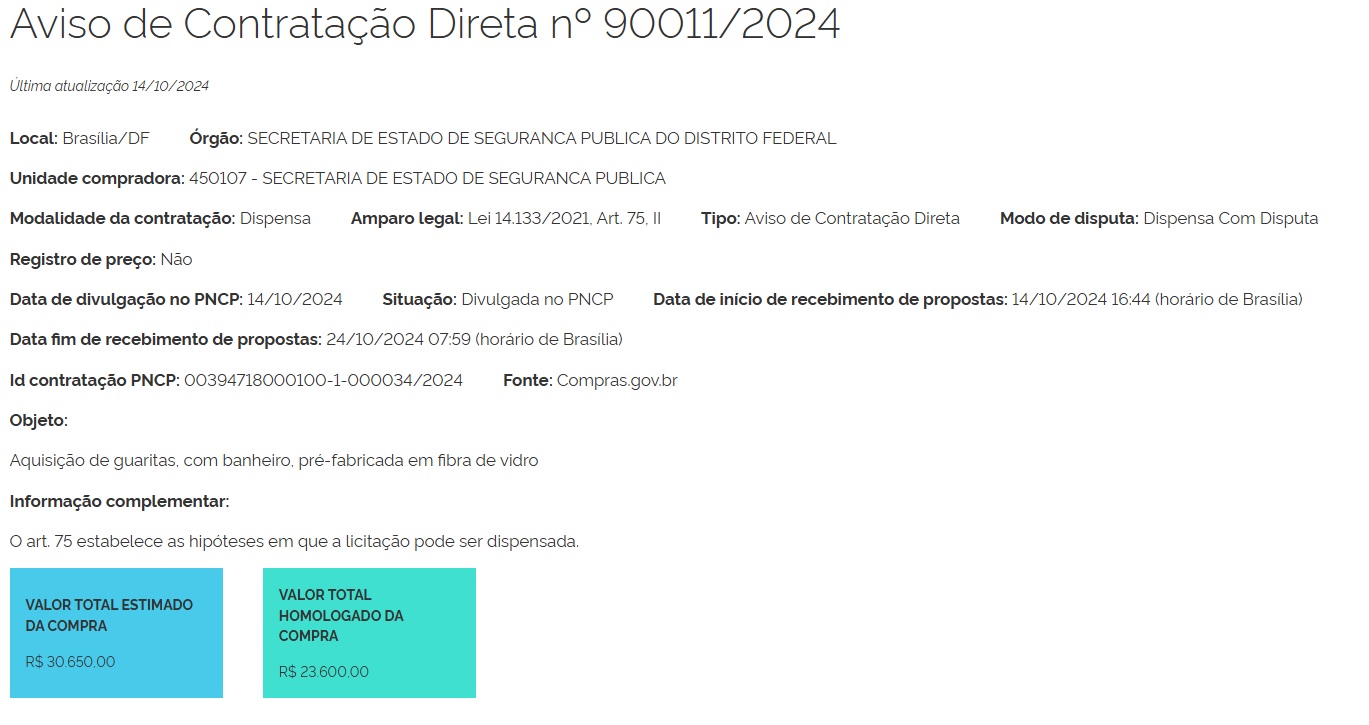 | 03/2023 | Contratação de Empresa para a prestação de serviços técnicos especializados em urna com alocação de 14 (quatorze) Técnicos de urna por 12 (doze) dias para atuarem no processo eleitoral para a Eleição das Diretorias dos Conselhos Comunitários da Secretaria de Estado de Segurança Pública do Distrito Federal | Aviso de Dispensa | Autorização | Extrato | Ata da Dispensa | Fracassado |