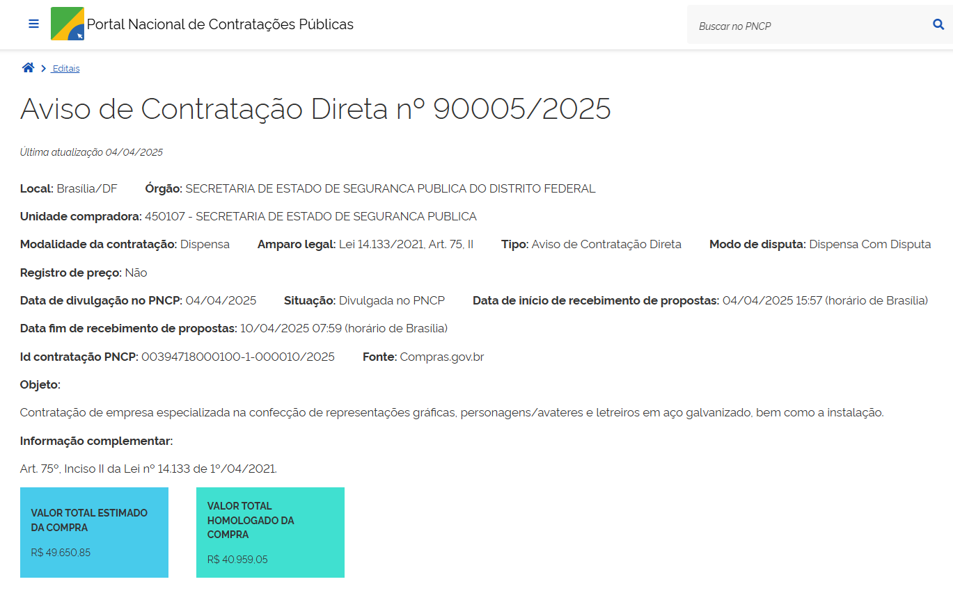 | 00050-00003336/2025-12 | Confecção de representações gráficas, personagens/avateres e letreiros em aço galvanizado, | DE n° 90005.2025 | Autorização | Relatorio de DE n° 90005.2025 | 10/04/2025 | ![]() |