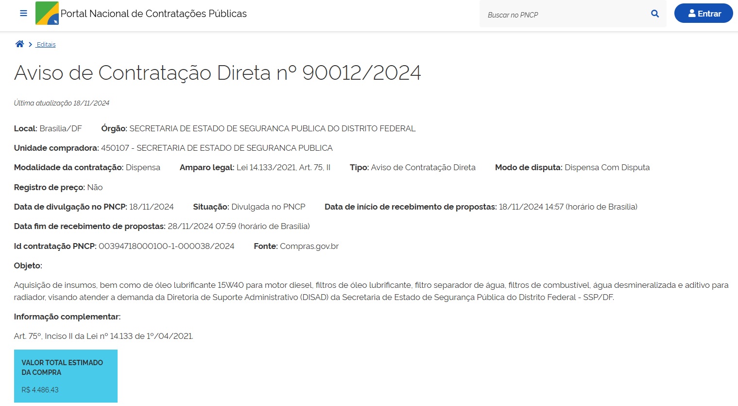 | PREGÃO ELETRÔNICO 90019/2024 | 00050-00001896/2024-43 | Contratação de empresa especializada para a prestação contínua de serviços comuns de seguro de pessoas e acidentes pessoais para 25.879 (vinte e cinco mil oitocentos e setenta e nove) servidores ativos da Polícia Civil do Distrito Federal, Polícia Militar do Distrito Federal e Corpo de Bombeiros Militar do Distrito Federal, mediante a implantação de apólice. | 29/07/2024