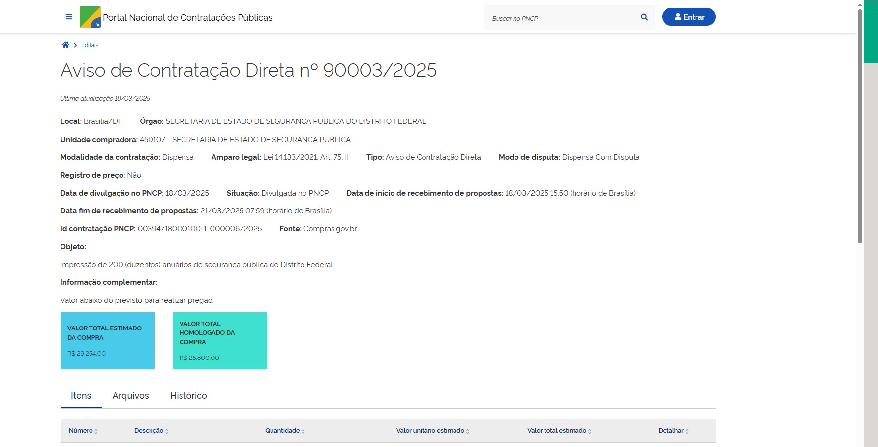 | 00050-00001987/2025-60 | Impressão gráfica de 200 (duzentos) exemplares do 1º Anuário de Segurança Pública do Distrito Federal, | DE n° 90003/2025 | Autorização | Relatorio de DE n° 90003.2025 | 18/03/2025 | ![]() |