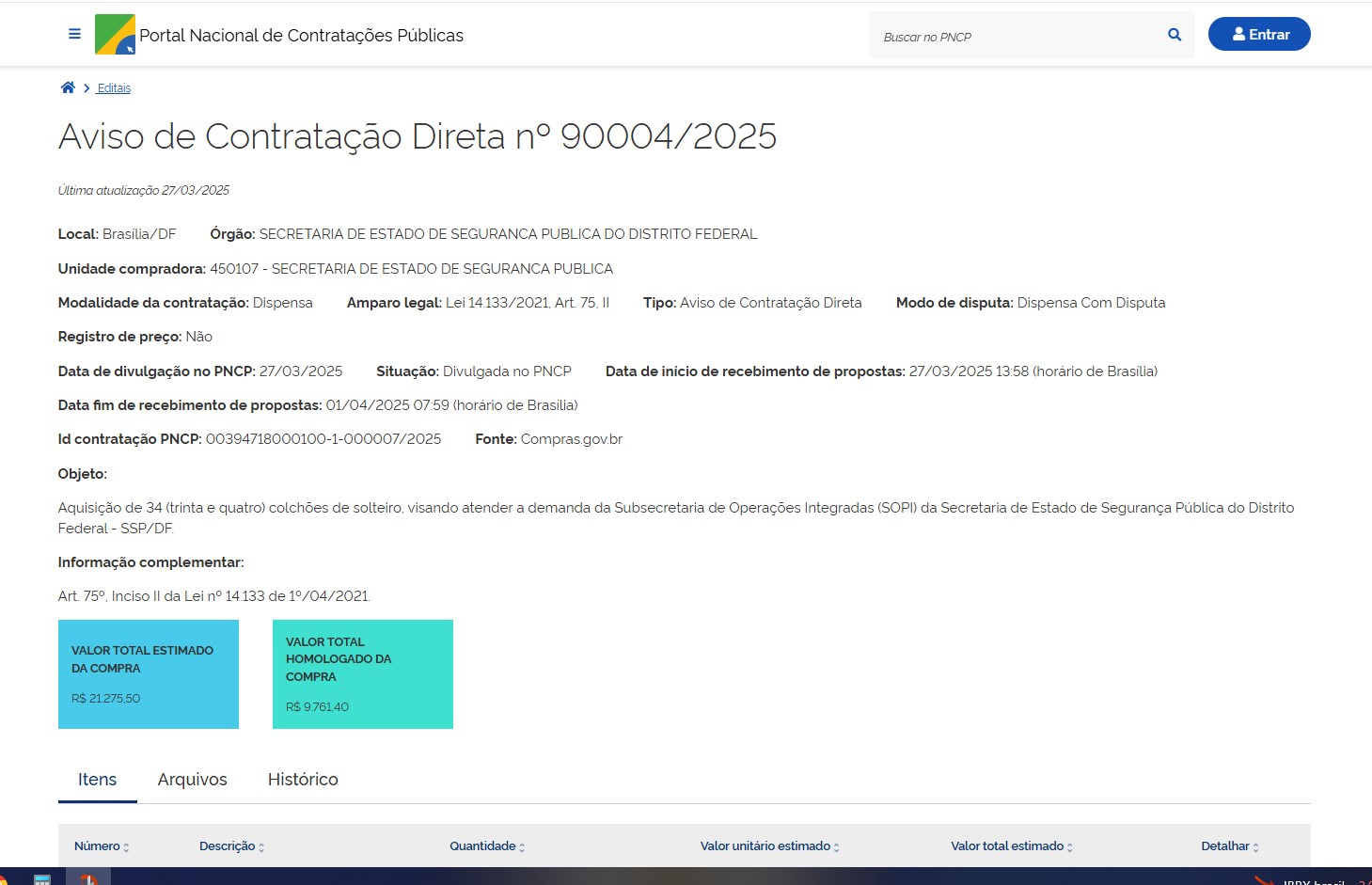 | 00050-00001079/2025-76 | Aquisição de 34 (trinta e quatro) colchões de solteiro, visando atender a demanda da SOPI. | DE n° 90004.2025 | Autorização | Relatorio-de DE n° 90004.2025 | 01/04/2025 | ![]() |