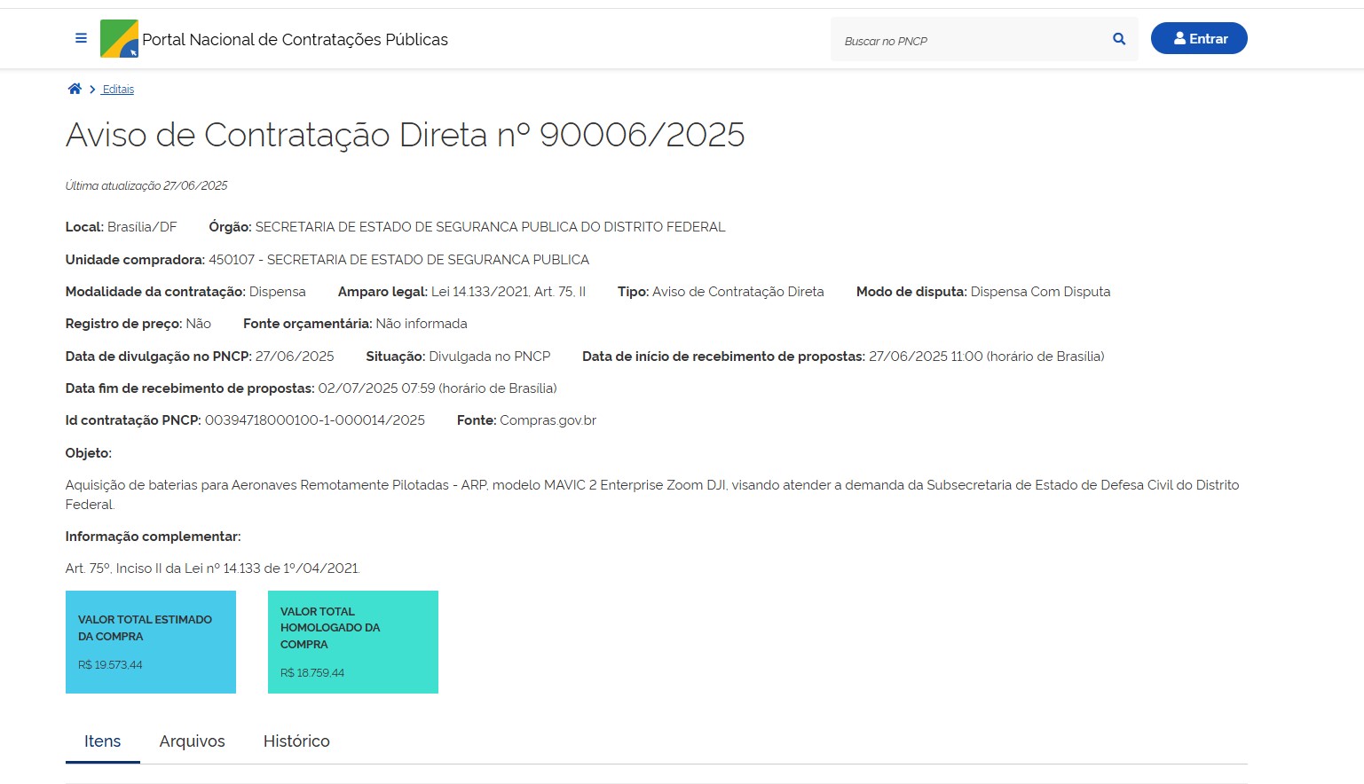 | 00050-00007409/2025-37 | Aquisição de baterias para Aeronaves Remotamente Pilotadas – ARP, modelo MAVIC 2 Enterprise Zoom DJI, para SUDEC | DE n° 90006.2025 | Autorização | Relatório de DE n° 90006.2025 | 02/07/2025 | ![]() |