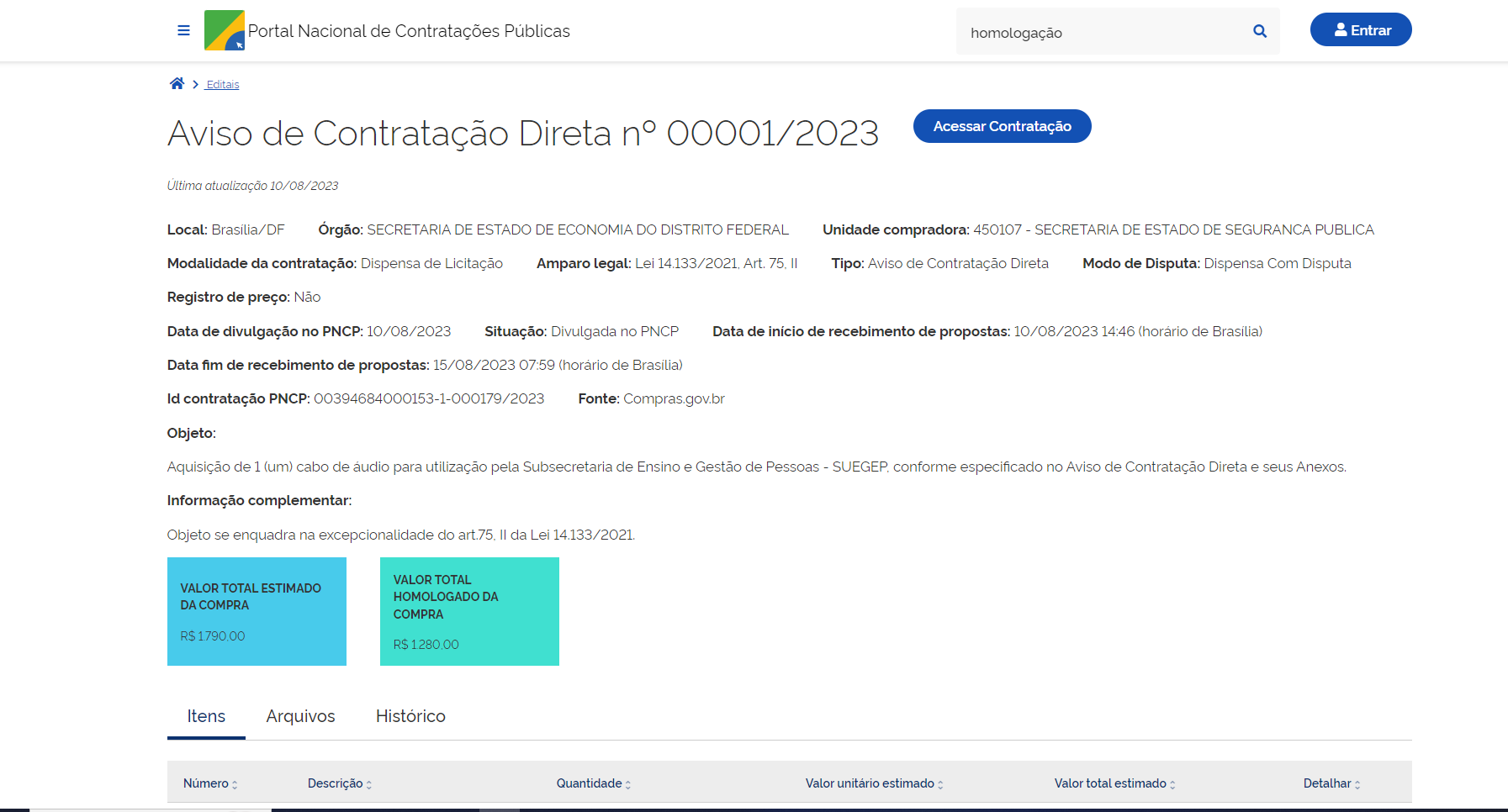 | 01/2023 | Aquisição de 1 (um) cabo de áudio para utilização pela Subsecretaria de Ensino e Gestão de Pessoas – SUEGEP, conforme especificado neste Aviso de Contratação Direta e seus Anexos. | Aviso de Dispensa | Autorização | Extrato | Ata da dispensa | ![]() |