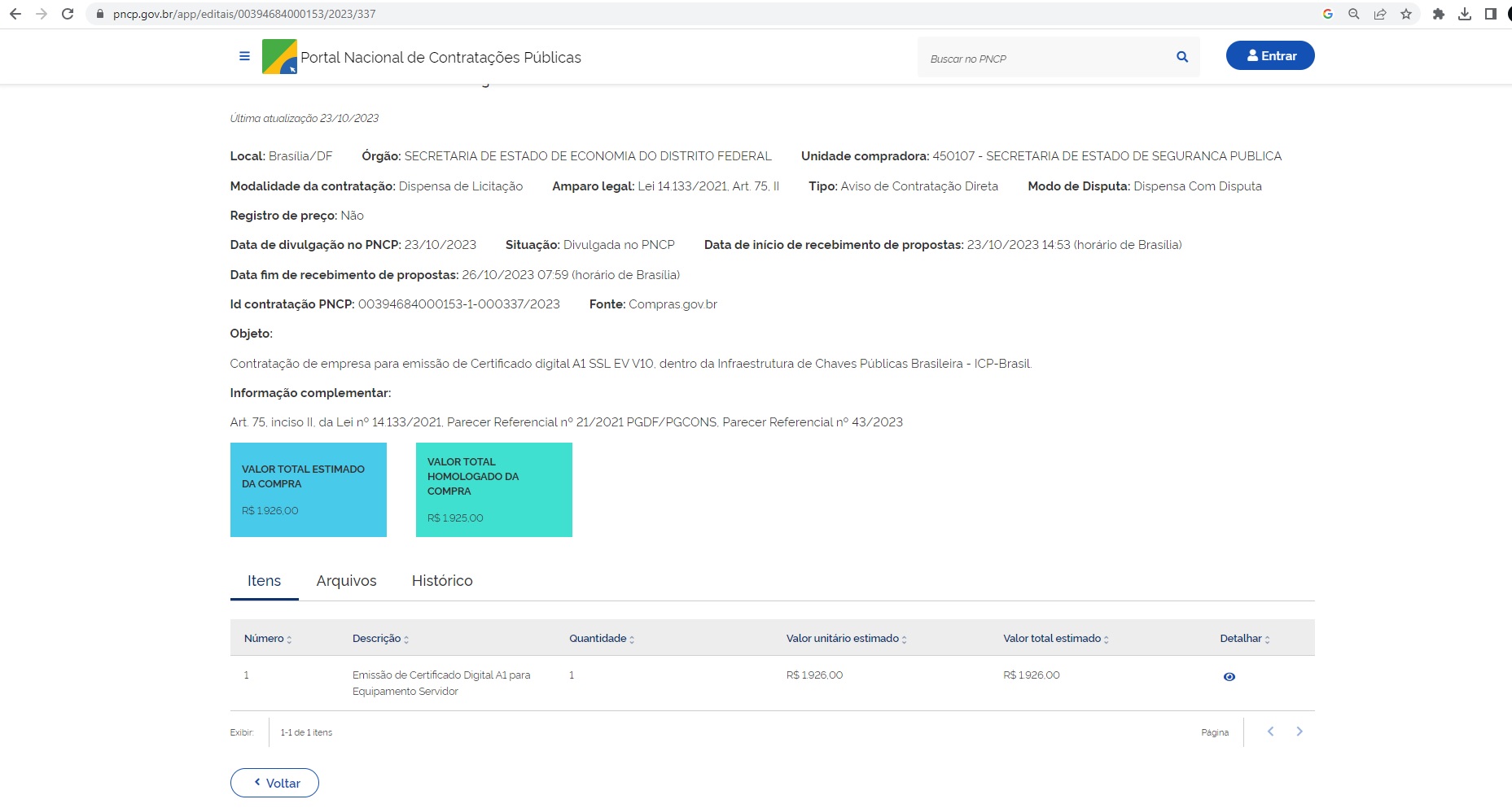 | 07/2023 | Aquisição de materiais elétricos, tais como: cabos flexíveis de 10mm, disjuntores monopolar, terminais olhal e agulha de 10mm, caixa multiuso interna com disjuntor e tomada, voltados ao atendimento de demanda de individualização dos circuitos elétricos da sede da SSPDF. | Aviso de Dispensa Eletrônica | Autorização | Extrato | Ata da Dispensa | PNCP- Homologação |